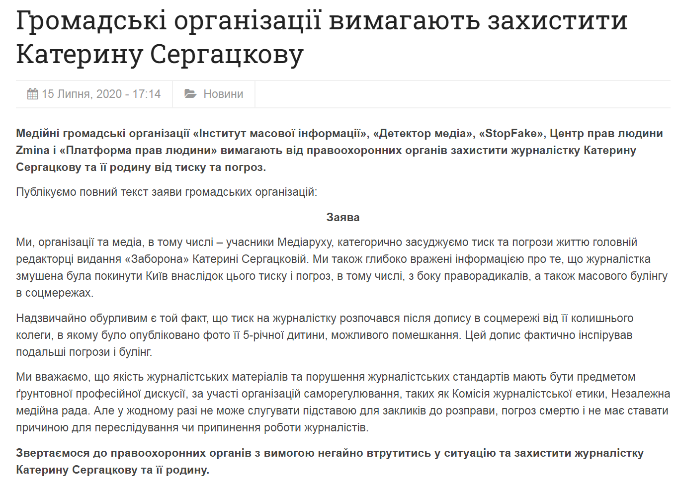 В результате медиа (живущие в основном на западные гранты), которые обвиняли "Заборону" во вранье и "пророссийской пропаганде", были вынуждены выступить в защиту журналистки. Чтобы сохранить лицо, они тоже призвали правоохранительные органы расследовать угрозы в ее адрес.