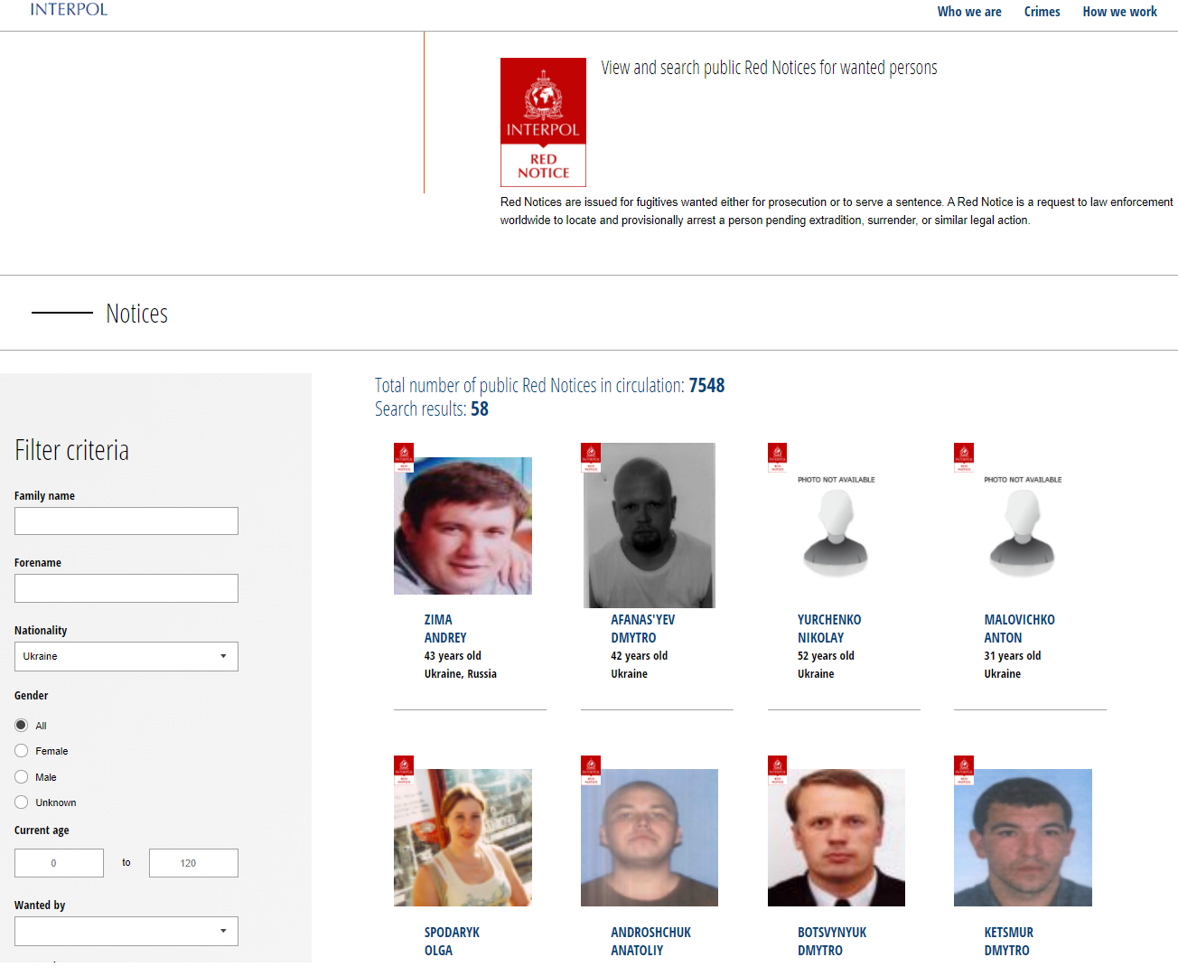 Сейчас на сайте Интерпола размещены "красные карточки" на 58 граждан Украины. Сама Украина объявила в международный розыск с размещением "красной карточки" 13 человек: