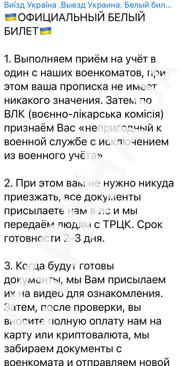 Дельцы также предлагают опцию по покупке белого билета. За 4 тысячи долларов можно купить документ, который освободит военнообязанного от службы в армии и позволит беспрепятственно выезжать за границу.