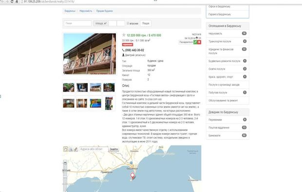 Так, представители СМИ раскопали объявление на одном из сайтов, где некий Дмитрий продавал базу отдыха в центре Бердянской косы на 360 квадратных метров за $470 тысяч.
