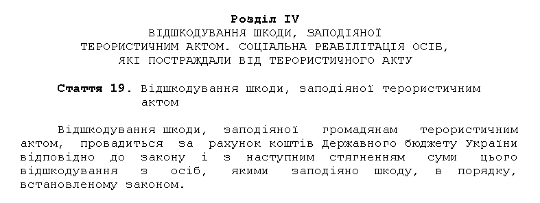 Ключевая норма закона, на основе которой принято решение суда – это статья 19 Закона "О борьбе с терроризмом". Согласно этой статье возмещение вреда, причиненного гражданам террористическим актом, производится за счет средств Государственного бюджета Украины в соответствии с законом: