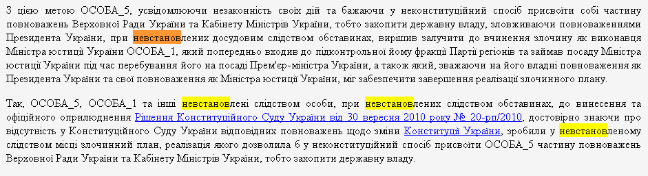 В результате этого, по мнению генпрокуратуры, Виктор Янукович якобы захватил власть в Украине путем присвоения части полномочий Верховной Рады и Кабинета Министров.