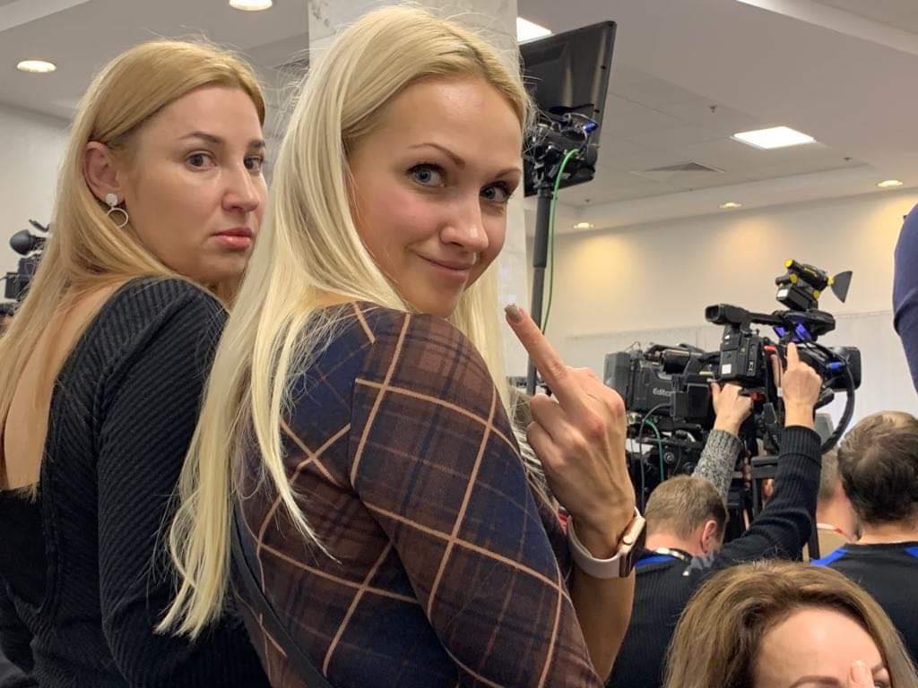 Я снимала происходящее в суде, передавала новости в редакцию. Для лучшего обзора встала на лавку, прямо передо мной тут же встала одна из подруг Кузьменко, блондинка (та, которая на фото показывает «фак» - Ред.). Я спокойно снимала, а она оборачивалась и смотрела на меня на протяжении всего заседания. Она фотографировала меня и снимала на видео, зачем – я не знаю. Показывала на меня своим подругам, называла меня «шариевской проституткой» и на весь зал кричала, что я из «Шария». Когда я возразила, что не работаю на «Шария» и показала редакционное удостоверение «Страны», она попыталась вырвать его у меня из рук. Другие же кричали, что «Страна» - это тоже очень плохое с их точки зрения издание.