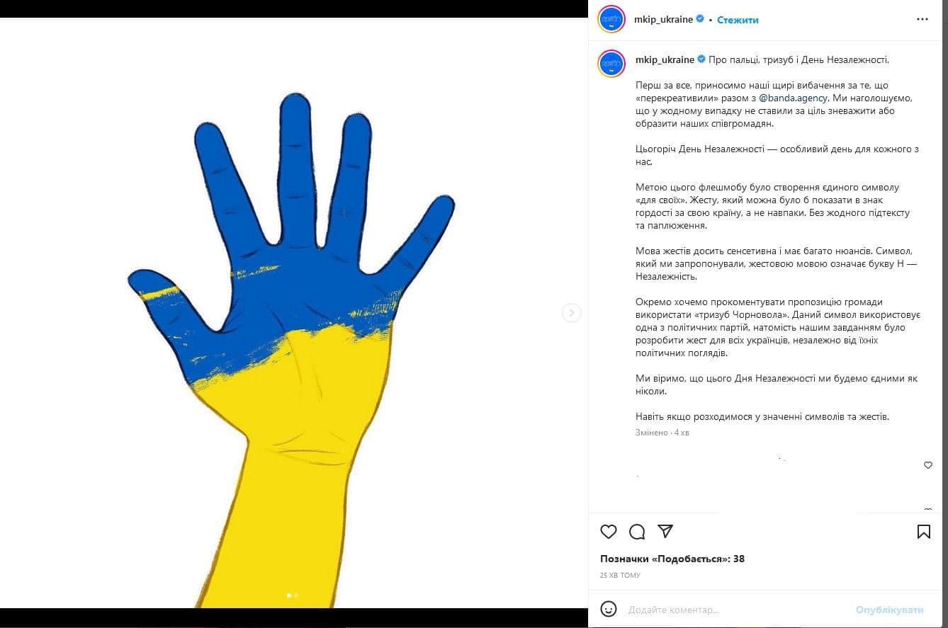 "Однако ваши комментарии убедили нас в том, что сила тризуба Чорновола бесспорна. Мы уважаем эту позицию и предлагаем использовать тот жест тризуба, который вам нравится", - говорится в заявлении на странице агентства в Instagram.