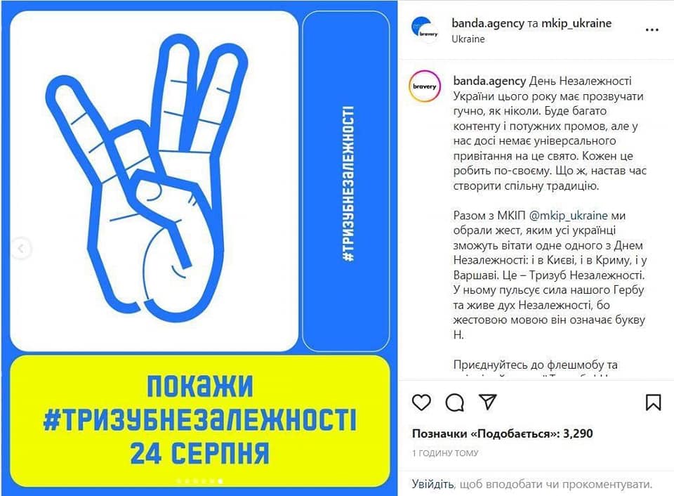 После волны хейта в Banda Agency примирительно предложили украинцам использовать любой жест Тризуба в День Независимости, не забыв указать хэштег #ТРИЗУБНЕЗАЛЕЖНОСТІ.