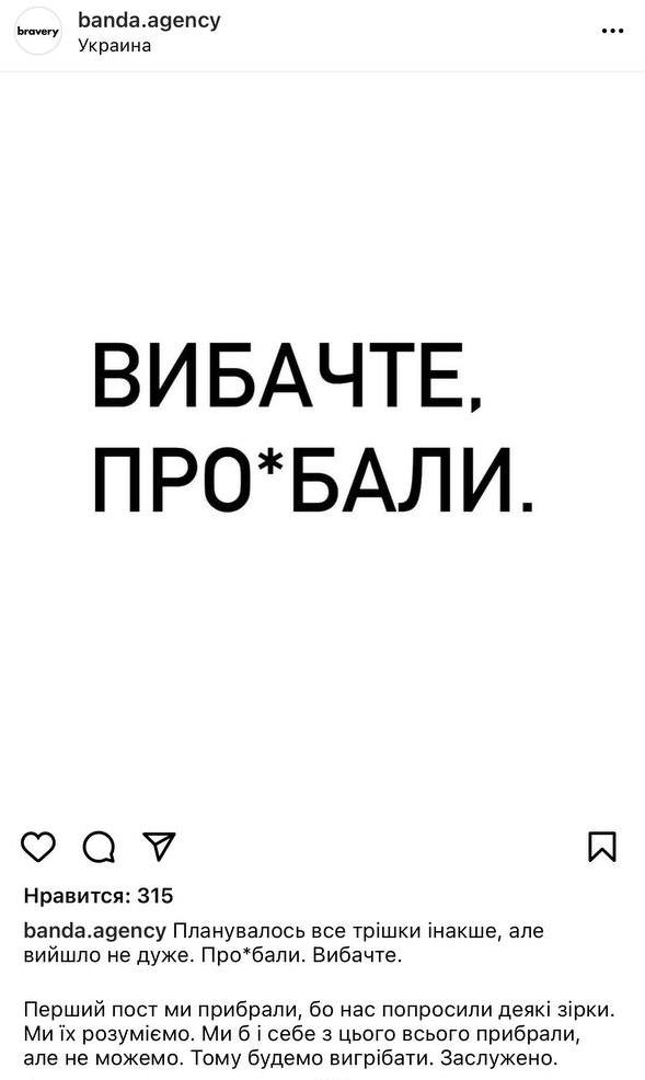 "Планировалось все немного иначе, но получилось не очень. Про*бали. Извините. Первый пост мы убрали, потому что нас попросили некоторые звёзды. Мы их понимаем. Мы бы и себя из этого всего убрали, но не можем. Поэтому будем выгребать. Заслужено", - заявили в агентстве.