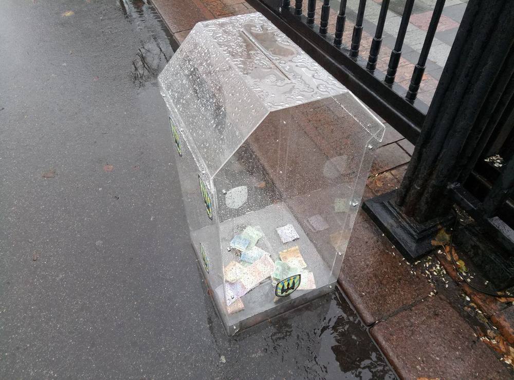 На улице даже поставили прозрачные боксы для сбора средств - на нужды лагеря. Правда, пока насобирать удалось не много. Фото: Анастасия Товт, Страна.ua