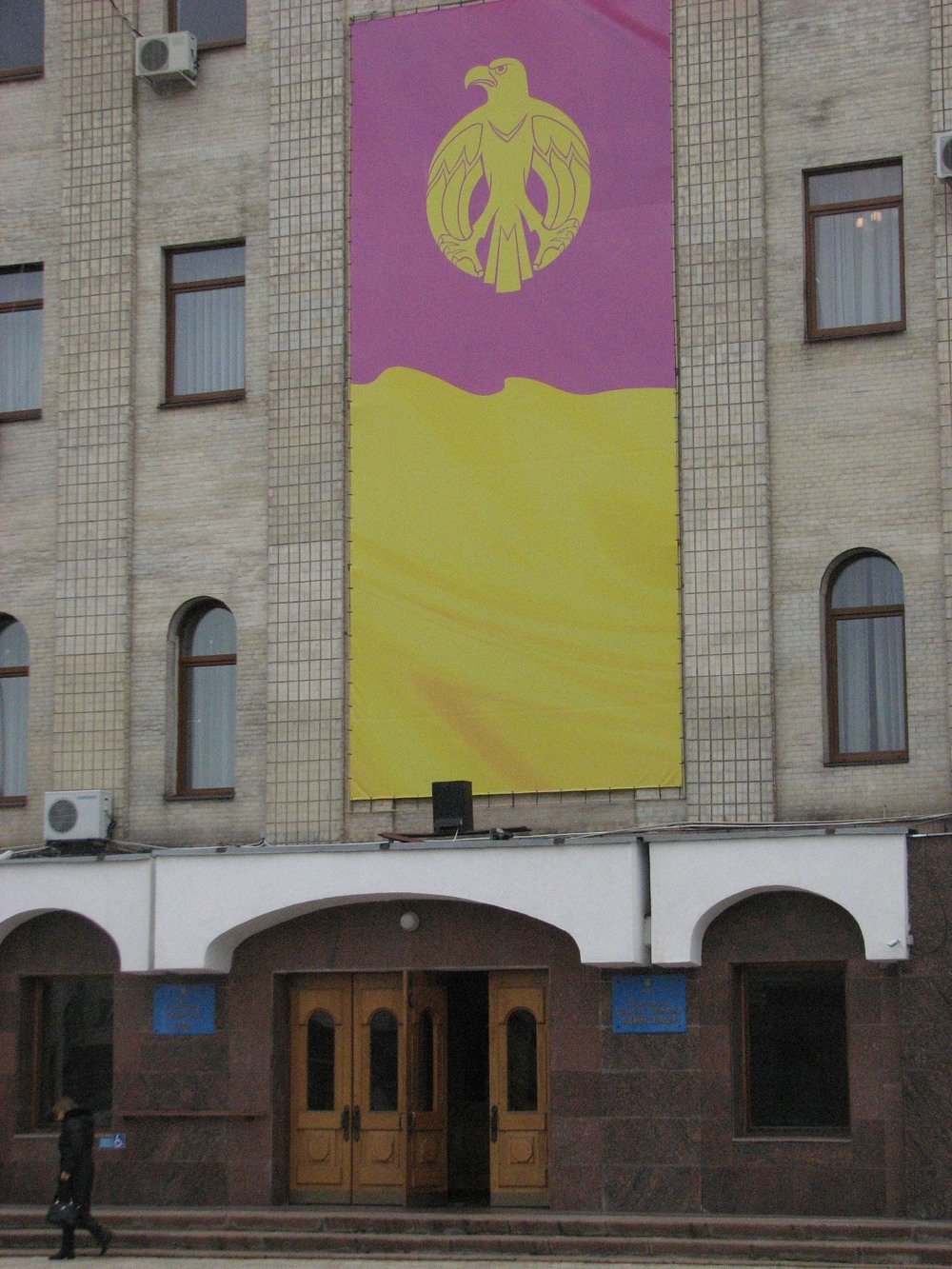 Сейчас на постаменте, где когда-то стоял памятник Кирову, водружен красно-черный флаг, а на здании обладминистрации за ним во весь фронтон вывешено полотно областного знамени с орлом. Кстати, областной символ – орел, странно похож на другого орла из истории 20 века.