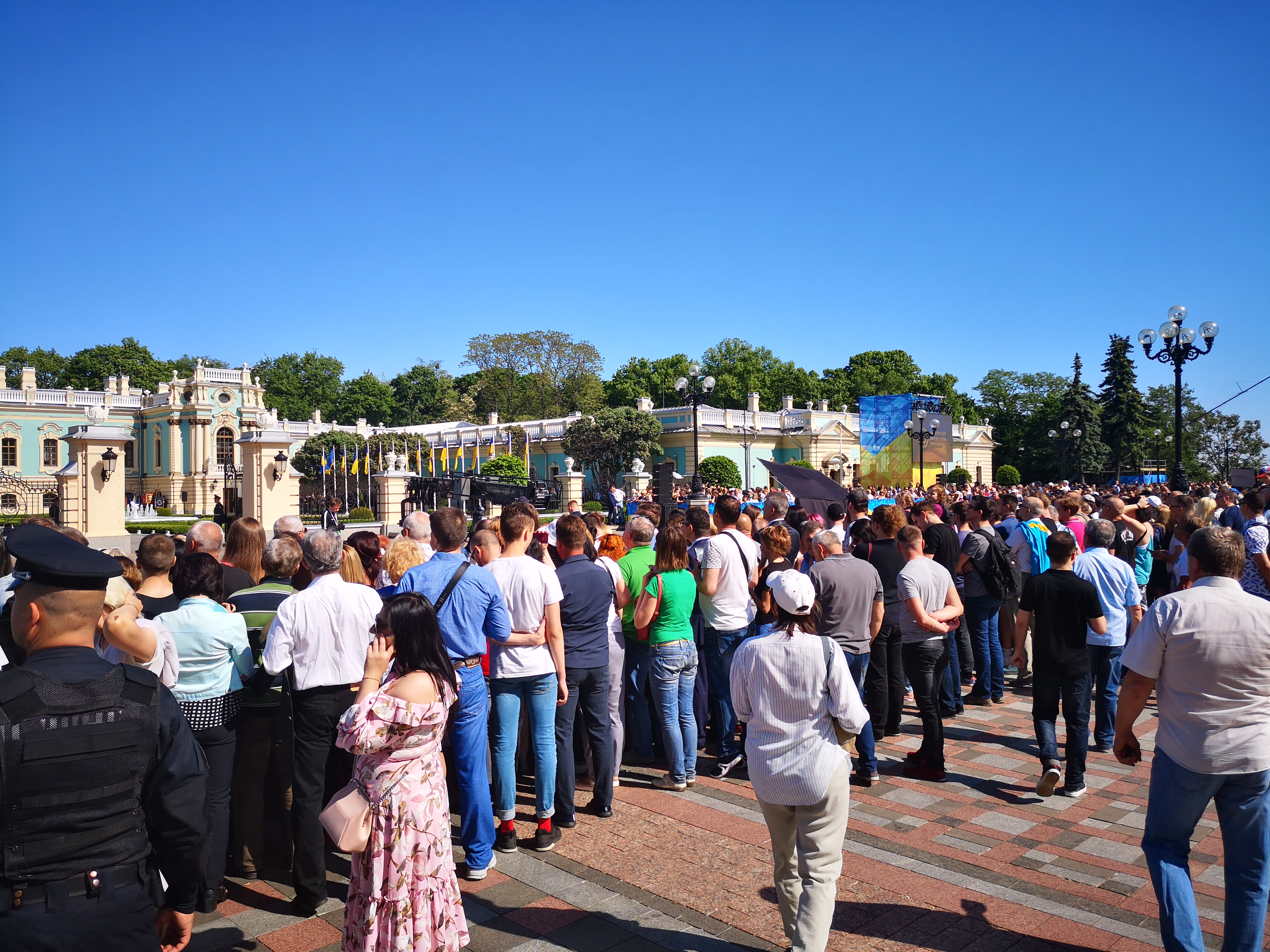 Владимир Зеленский появляется под стенами Верховной Рады неожиданно. Буквально через пять минут он примет присягу и произнесет инаугурационную речь, официально став шестым президентом Украины. Здесь его уже поджидают несколько сотен поклонников, которые тянут к нему руки, просят селфи и кричат "Вова, давай!" Совершенно нет ощущения, что перед нами – президент. Это скорее похоже на встречу актера с фанатами.