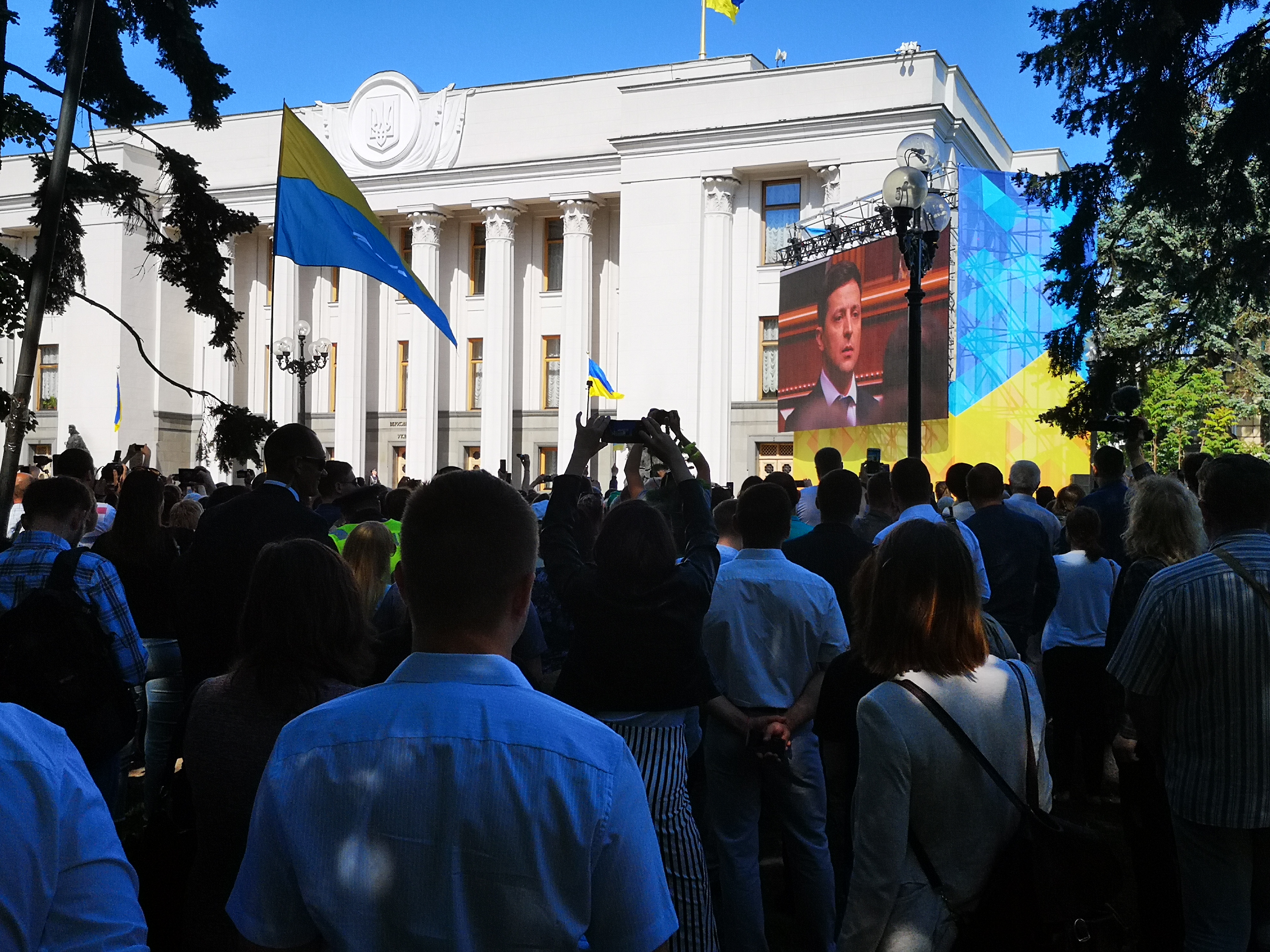 За тем, как Зеленский поднимается по мраморным ступенькам Верховной Рады, по экрану на площади неотрывно наблюдают сотни глаз.