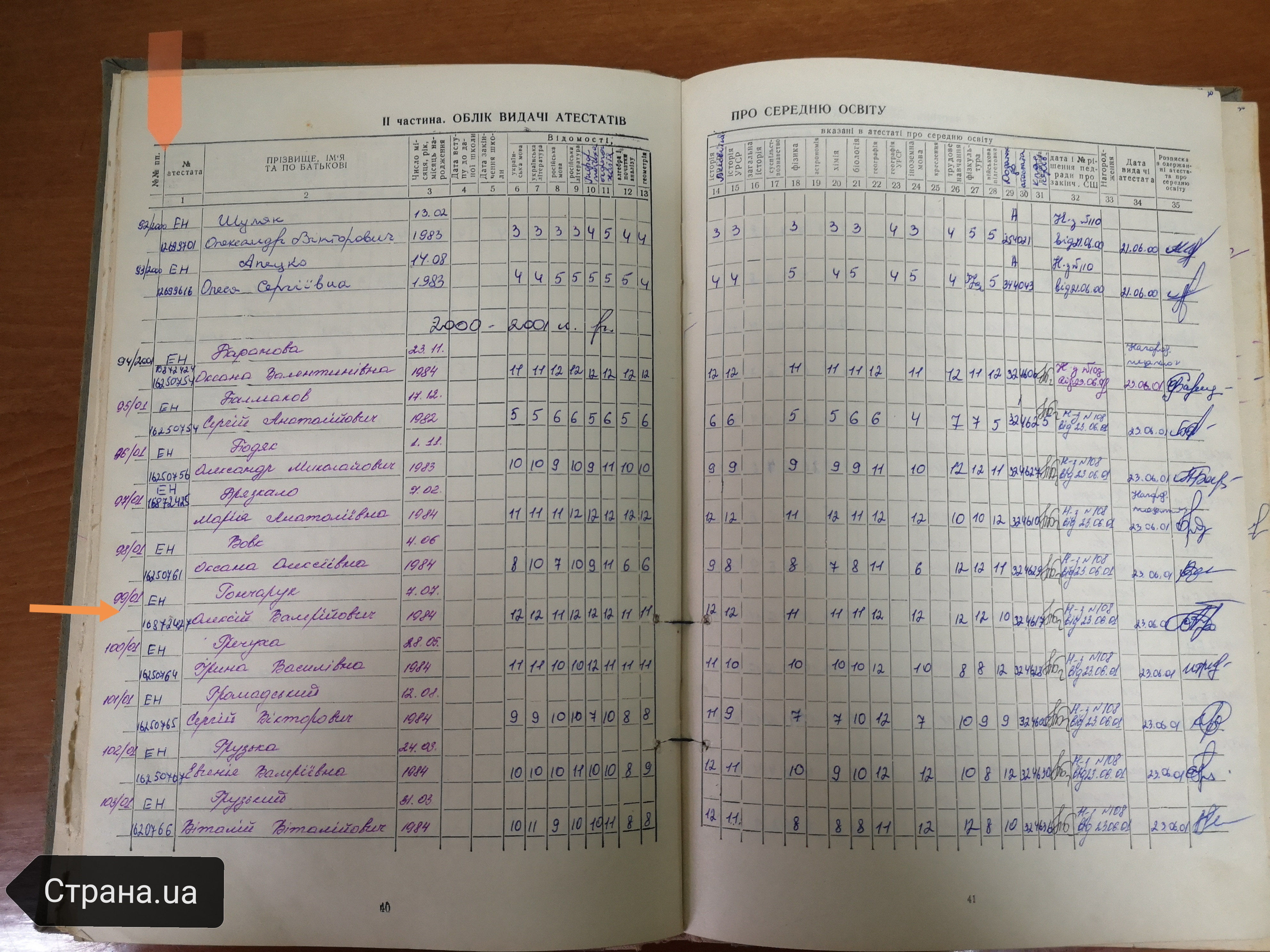 Светлана Хоменко с гордостью демонстрирует "Книгу выдачи аттестатов" с оценками будущего премьера – там одни “11” и “12”. Самая низкая оценка – единственная "10" по "Военной подготовке".