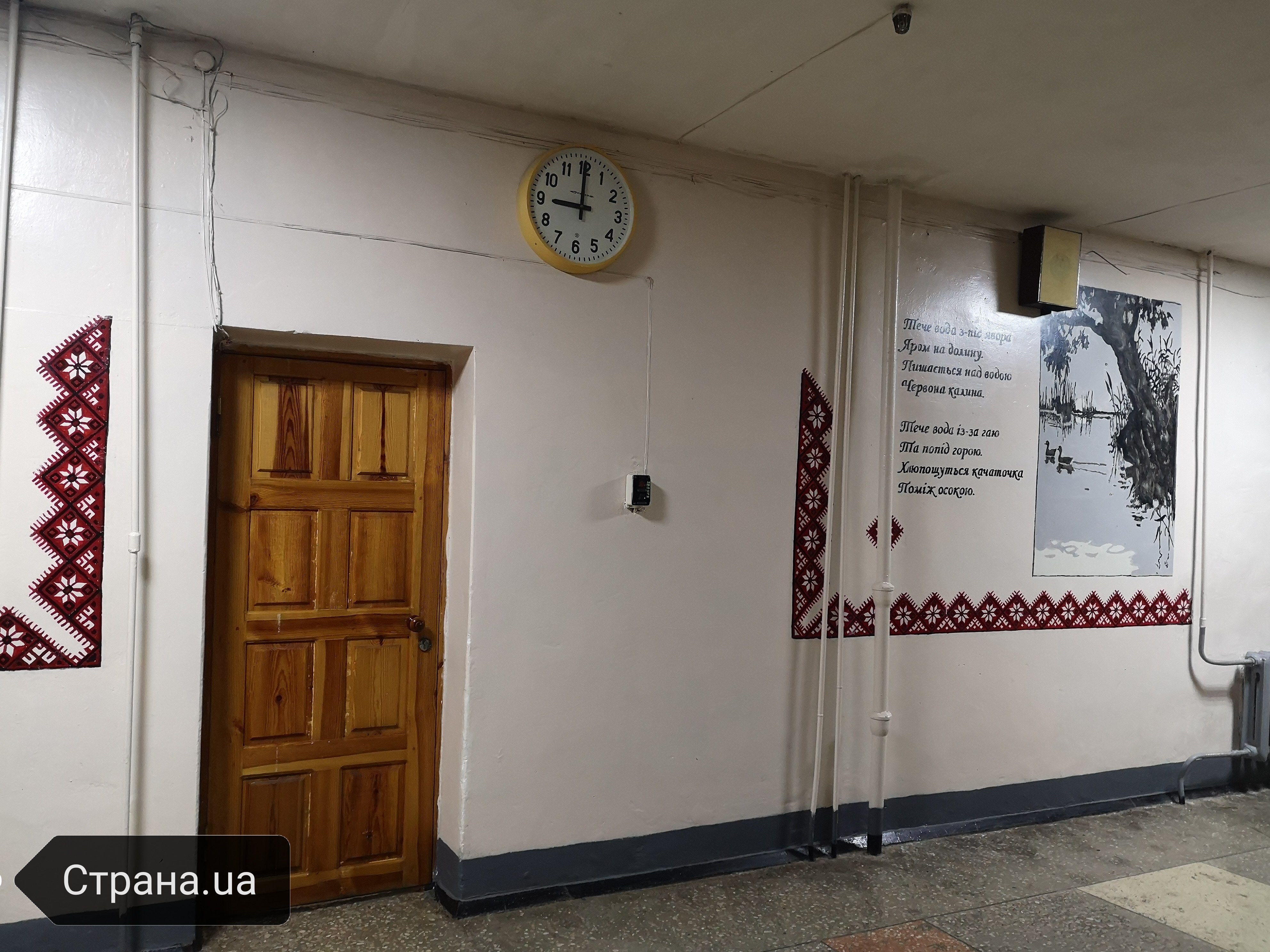 На стенах – цитаты из поэзии Тараса Шевченко, пейзаж с утками на озере и орнамент вышиванки: судя по стилю и местами облезшей краске, остались еще с ранних постсоветских времен.