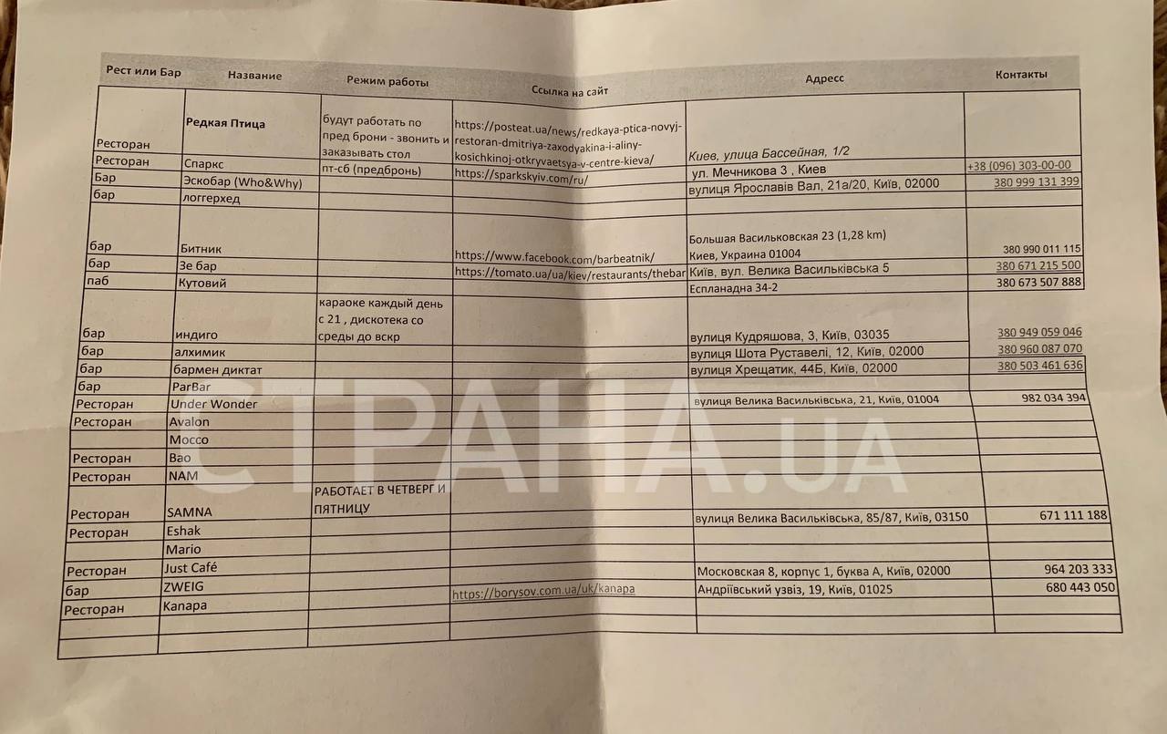 Распечатка с названиями ресторанов, которые могут открыться по желанию постояльцев отеля 11 Mirrors даже в локдаун. Фото: "Страна"