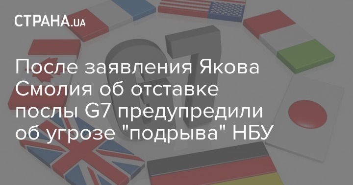 Послы государств "Большой семерки" (G7) прокомментировали заявление главы НБУ Якова Смолия об отставке. Иностранные дипломаты указали на "угрозу подрыва независимости финансового регулятора" Украины. Об этом говорится в Twitter-микроблоге "Послы G7 за реформы в Украине".