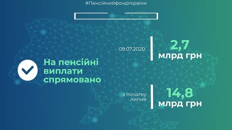 "9 июля 2020 Пенсионный фонд Украины, согласно утвержденному графику, продолжает финансирование пенсий июля. На пенсионные выплаты направлено 2,7 миллиарда гривен", - говорится в сообщении.