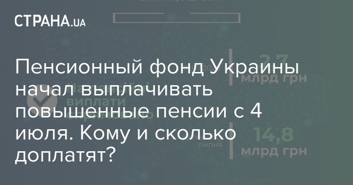 На фоне повышения размера пенсий, Пенсионный фонд Украины (ПФУ) в четверг, 9 июля, направил на их финансирование еще 2,7 миллиарда гривен. Всего с начала июля профинансировано пенсий на сумму 14,8 миллиарда гривен.