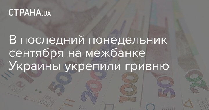 В понедельник, 28 сентября, на межбанковском валютном рынке курс гривни укрепился до 28,2800 грн/$1 с 28,3025 грн/$1 в предыдущий рабочий день. Котировки нацвалюты на закрытии торгов составили 28,27-28,29 грн/$1. Об этом сообщает "Интерфакс-Украина" со ссылкой на дилеров коммерческих банков.