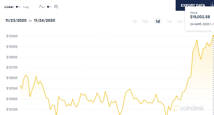 Так, согласно графику, биткоин достиг отметки в 19,002 долларов.