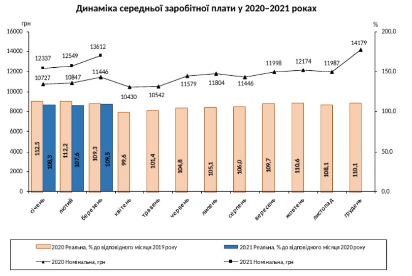 Средняя номинальная заработная плата штатных работников в марте 2021 года по сравнению с февралем-2021 увеличилась на 8,5%, а в годовом измерении выросла на 18,9%, составив 13 612 грн, что в 2,3 раза выше уровня минимальной зарплаты (6000 грн).