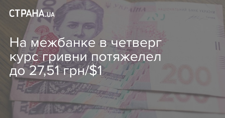 Курс гривни на межбанковском валютном рынке в четверг потяжелел на 5 копеек. Национальная валюта укрепилась до 27,510 грн/$1 с 27,555 грн/$1 в предыдущий рабочий день. Котировки гривни на закрытие торгов составили 27,50-27,52 грн/$1. Об этом пишет "Интерфакс-Украина" со ссылкой на дилеров коммерческих банков.