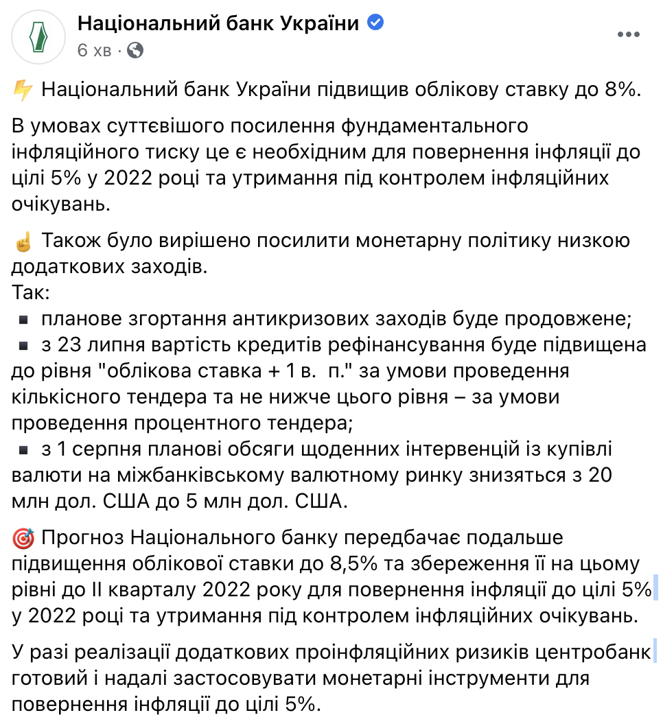 "Прогноз Национального банка предусматривает дальнейшее повышение учетной ставки до 8,5% и сохранения ее на этом уровне до второго квартала 2022 для возвращения инфляции к цели 5% в 2022 году и удержания под контролем инфляционных ожиданий. В случае реализации дополнительных проинфляционная рисков центробанк готов и в дальнейшем применять монетарные инструменты для возвращения инфляции к цели 5%", - добавили в НБУ.