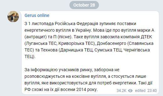 "С 1 ноября Российская Федерация останавливает поставки энергетического угля в Украину. Речь идет об углях марки А (антрацит) и П (постный). Такой уголь завозила компания "ДТЭК" (Луганская ТЭС, Криворожская ТЭС), "Донбассэнерго" (Славянская ТЭС) и "Технова" (Дарницкая ТЭЦ, Сумская ТЭЦ, Черниговская ТЭЦ)", - сообщил он.