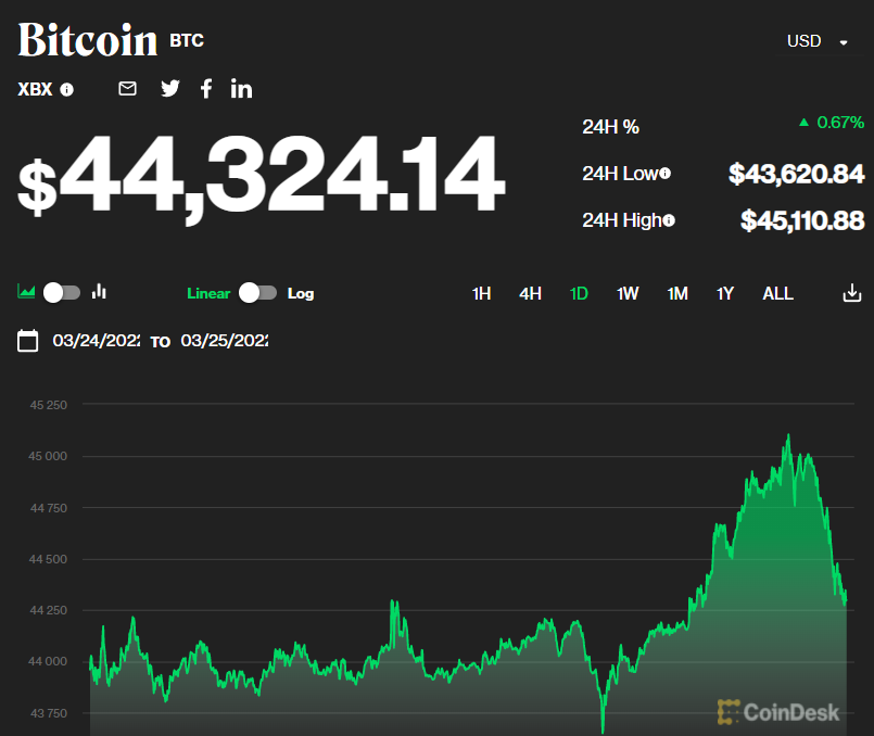 На данный момент, как указывается на сайте Coindesk, стоимость биткоина составляет 44 тысячи долларов за монету.