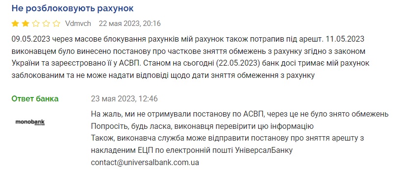О похожих инцидентах заявляют также клиенты monobank. Там также говорят о нежелании банка оперативно разблокировать счет при наличии документа под это. Хотя в Украине с 2019 года действует Автоматизированная система исполнительного производства, АСИП (АСВП - укр.), которая позволяет это делать за считанные часы или даже минуты.