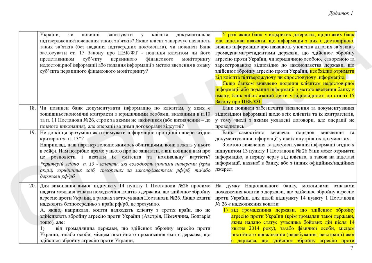 Это практические разъяснения к постановлению Нацбанка №26 от 16 марта, о котором ранее писала "Страна". Этим документом от банков потребовали проверять своих клиентов (физлиц и юрлиц) на связь с Россией, также как и их партнеров/контрагентов. Если компания, например, закупает сырье или аппаратуру у какого-то поставщика, то она не только должна знать, что тот не имеет российского происхождения, но также, что у него нет партнеров в РФ (кроме россиян, которым Украина предоставила статус участника боевых действий после 14 апреля 2014 года).
