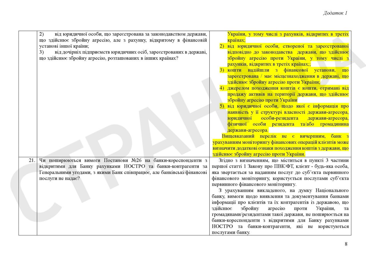 "Вышеуказанный перечень не исчерпывающий, банк с учетом мониторинга финансовых операций клиентов может определить дополнительные признаки происхождения средств из государства, осуществляющего вооруженную агрессию против Украины", - при этом говорится в ответах Нацбанка.