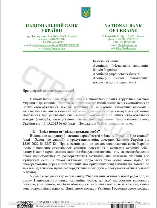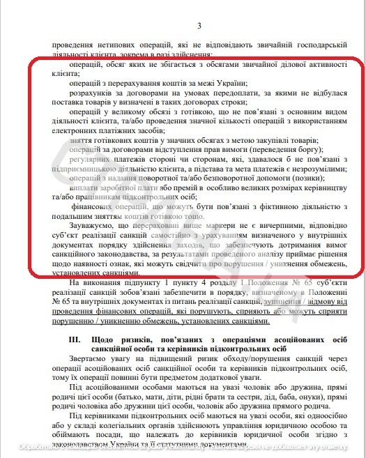 Этот документ посвящен операциям "подконтрольных лиц". К таким лицам регулятор относит только субъектов хозяйствования - не физлиц, а только бизнес. Который, по мнению банков, может иметь связь или поддерживать отношения с подсанкционными лицами. Чиновники считают, что контроль за ними нужен, чтобы подсанкционники не могли использовать эти компании для своих целей - чтобы продолжать пользоваться банковским услугами в обход санкций.