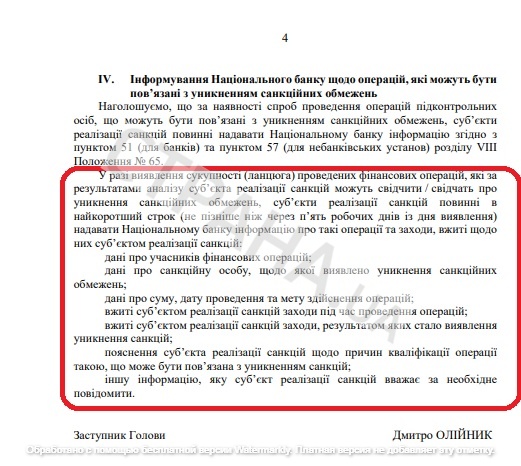 Национальный банк потребовал от банков тщательнее проверять финансовые операции бизнеса (компаний), которые, по их мнению, ранее имели или до сих пор имеют отношение к подсанкционным лицам. А также предоставлять в НБУ детальный отчет о каждой попытке обойти санкции, с поименным указанием всех участников схемы.