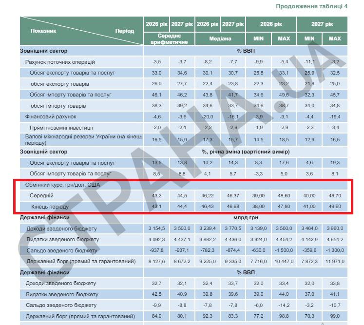 • 2027 год: 40,0 грн/$ — средний, 41,0 грн/$ — на конец года.
