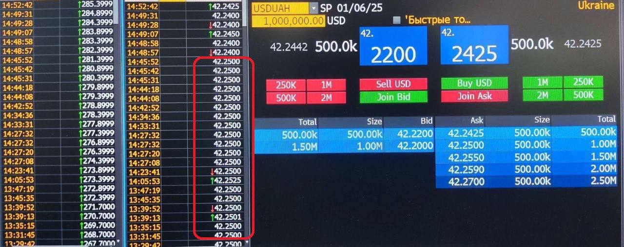 Торговля на площадке Bloomberg стартовала с 42,17 грн/$ и достигала 42,25 грн/$ и только к закрытию торгов отступила на 42,23 грн/$. Объем торгов там сегодня вырос в 1,4 раза — со $199 млн до $289 млн. Большую его часть покрывал Нацбанк продажами доллара из своих золотовалютных резервов.