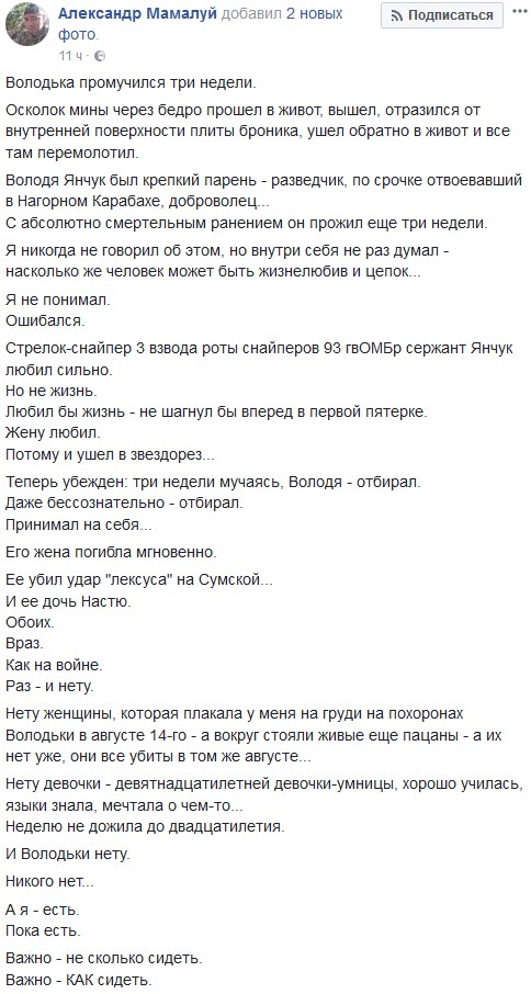 "Володя Янчук был крепкий парень - разведчик, по срочке отвоевавший в Нагорном Карабахе, доброволец... Стрелок-снайпер 3 взвода роты снайперов 93 гвОМБр сержант Янчук любил сильно. Но не жизнь. Любил бы жизнь - не шагнул бы вперед в первой пятерке. Жену любил", - заявлено в сообщении.