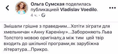 "Хотели сыграть для жителей Хмельницкого "Анну Каренину". Запрещают Льва Толстого на языке оригинала, а между тем это произведение входит в школьную программу, как зарубежная литература. Обидно...", - отметила Сумская.