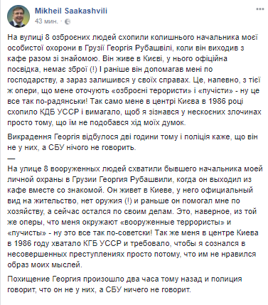 "8 вооруженных людей схватили бывшего начальника моей личной охраны в Грузии Георгия Рубашвили, когда он выходил из кафе вместе со знакомой. Он живет в Киеве, у него официальный вид на жительство, нет оружия. И ранее он помогал мне по хозяйству, а сейчас остался по своим делам. Это, наверное, из той же оперы, что меня окружают "вооруженные террористы" и "путчисты" - ну это все так по-советски!", - отмечает Саакашвили.