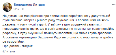 По словам Литвина, такое решение он принял в связи с голосованием участников группы за законы по пенсионной реформе.