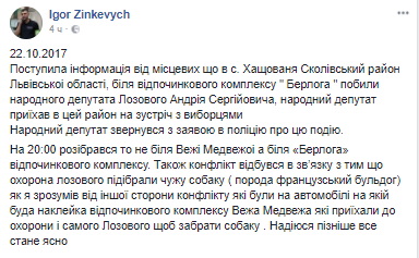 "Конфликт возник в селе Хащованя Сколевский района возле базы отдыха "Берлога". Лозовой приехал туда на встречу с избирателями", – написал он.