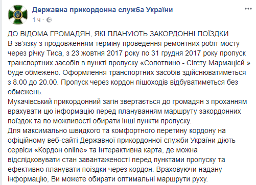 "Мукачевский пограничный отряд обращается к гражданам с просьбой учесть эту информацию перед планированием маршрута зарубежных поездок и по возможности выбирать другие пункты пропуска", - сказано в сообщении.