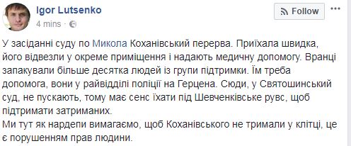 Командиру ОУН Николаю Коханивскому стало плохо в зале Святошинского суда. Об этом написал нардеп Игорь Луценко на своей странице в Facebook.