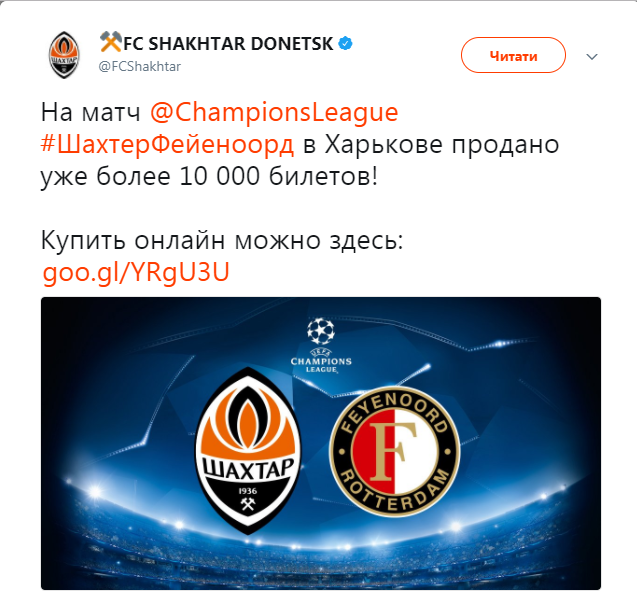 Донецкий клуб уже начал продажу билетов на домашний поединок Лиги чемпионов и всего за пять дней было продано 10 000 заветных тикетов, как передает официальный Twitter команды.