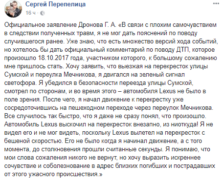 Адвокат Геннадия Дронова, второго участника резонансного ДТП в Харькове, Сергей Перепелица в Facebook обнародовал официальное заявление своего клиента.