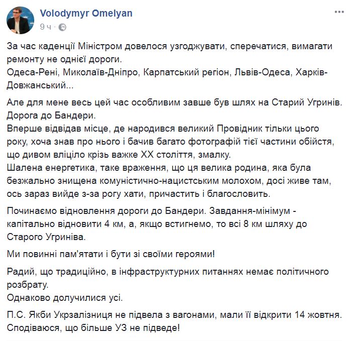 Министр инфраструктуры Владимир Омелян решил построить дорогу к селу Старый Угринов, на родину Степана Бандеры, после того, как был поражен "безумной энергетикой этого места". Об этом министр написал в своем Facebook.
