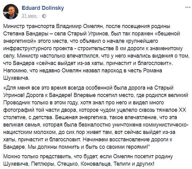 "Министр настолько впечатлился, что у него начались видения о том, что Бандера "сейчас выйдет из-за хаты, причастит и благословит". Напомню, что недавно Омелян назвал пароход в честь Романа Шухевича. Можно только представить, что будет, если Омелян посетит родину Шухевича, Петлюры, Стецько, Коновальца, Телиги и других!", - пишет Долинский на своем Facebook.