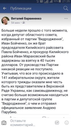 "Больше недели прошло с того момента, когда депутат областного совета, избранный от партии "Видродження", Иван Бойченко, он же брат председателя Килийского райсовета Павла Бойченко, и прокурор Килийского района Иван Мараховский были задержаны за взятку в 40 тысяч долларов. От руководства Партии никакой реакции не поступило", - написал Барвиненко.