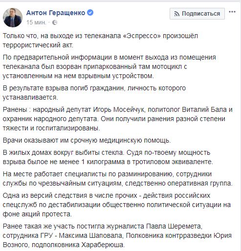 "Только что, на выходе из телеканала "Эспрессо" произошел террористический акт. По предварительной информации в момент выхода из помещения телеканала был взорван припаркованный там мотоцикл с установленным на нем взрывным устройством. В результате взрыва погиб гражданин, личность которого устанавливается", - сообщил он.