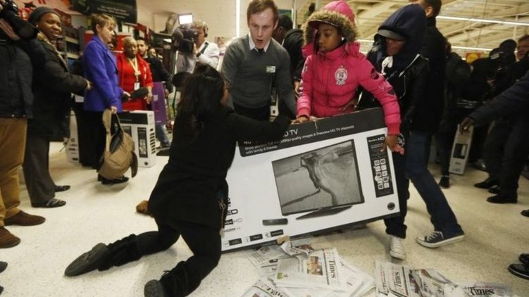 В западных странах стало традицией занимать очередь под магазинами с ночи, а то и с вечера, а попав в торговый зал, сгребать все, что попадется под руку, чтобы не упустить выгодную покупку. Часто люди травмируются в давке, нередки и потасовки из-за приглянувшегося разным людям товара.