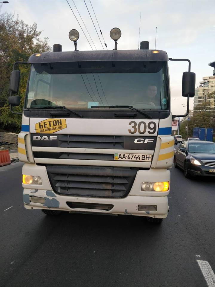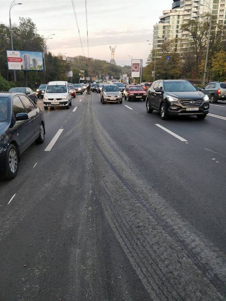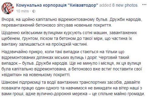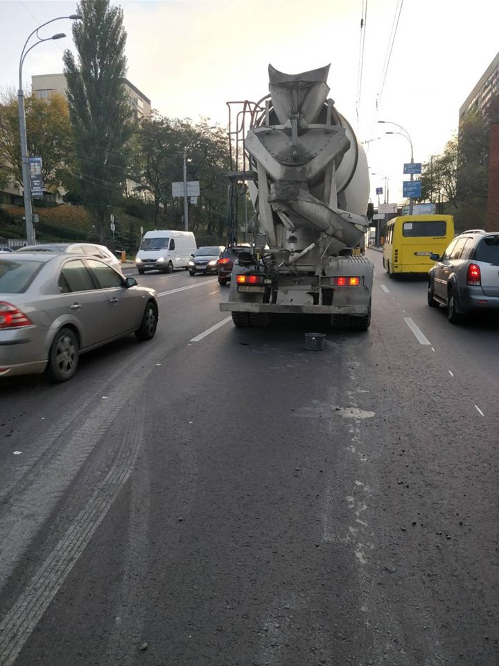"Вчера, на только что капитально отремонтированной ул. Дружбы народов, перегружен бетоновоз испортил новенькое покрытие. Ежедневно по киевским улицам курсируют сотни машин, загруженных щебнем, грунтом, песком и бетоном до такой степени, что часть их груза остается на проезжей части", - говорится в сообщении.