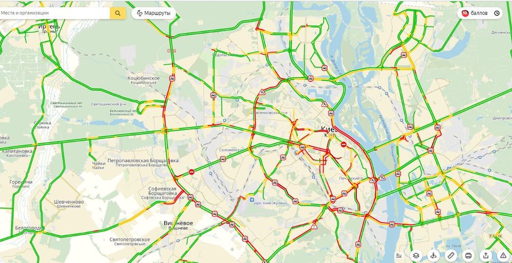 Сегодня, 26 октября к вечеру в Киеве образовались рекордные десятибалльные пробки. Город практически стоит.